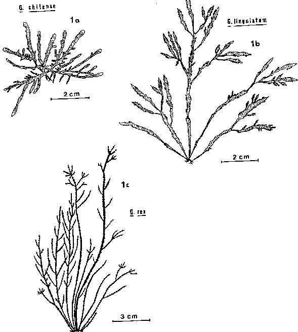 The Type specimen of Gelidium chilense was collected at Coquimbo, central Chile (30°S), and is now deposited in the Montagne Herbarium, Museum National d'Histoire Naturelle, Paris (Santelices and Montalva, 1983). The Lectotype of Gelidium lingulatum Kutzing is a plant labelled 'Herbarium Kutzing No. 46' deposited at the Rijksherbarium, Leiden. Previously; the specimen No. 33241 in Herb. Agardh, University of Lund, identified by J. Agardh had been chosen as lectotype by Levring (1960). Both plants probably came from the same place in southern Chile in the proximity of Valdivia (Santelices and Montalva, 1983).