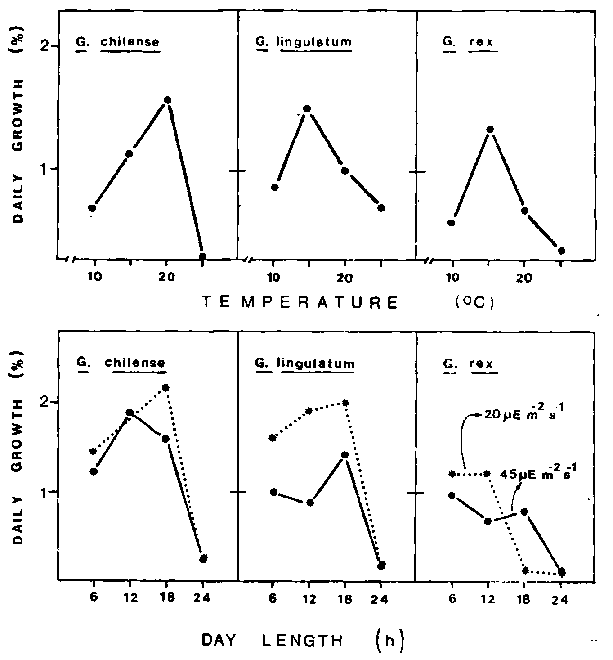 The few ecological studies performed with the three Chilean species of Gelidium (Oliger and Santelices, 1981) have shown that they have temperature tolerance ranges from 10 to 25°C. Growth does not occur above and below these limits (Oliger and Santelices, 1981). Growth rates are maximum at 20°C for Gelidium chilense and at 15°C for G. ligulatum and G. rex (Fig. 6).