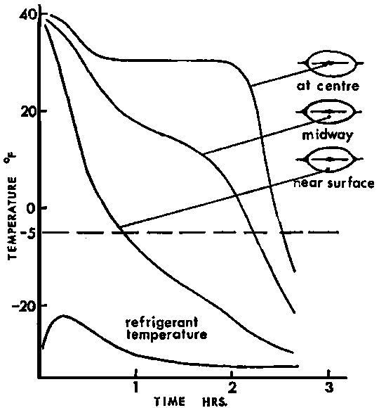 A knowledge of product freezing times will help especially to reduce errors in operating air blast and immersion freezers which, because of their design, are more versatile in the shape and size of product they can accommodate and can therefore be overloaded. A more detailed discussion of the problems of loading blast freezers is given in Advisory Note 35.