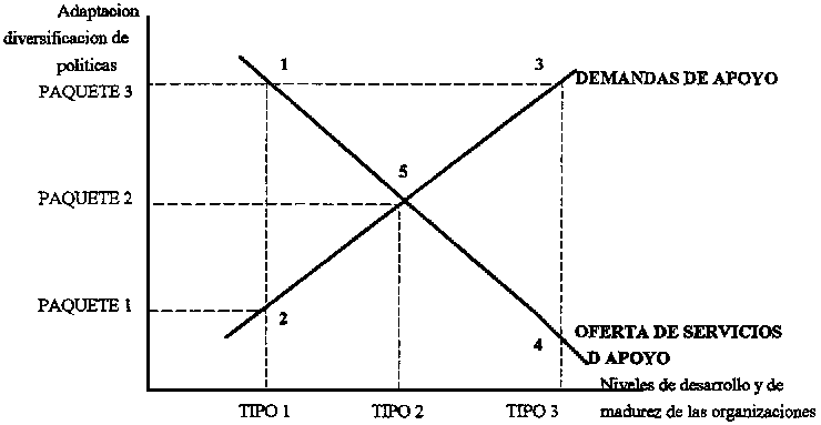 La curva de la oferta de servicios de apoyo es decreciente ya que se supone que la oferta debería ser mas fuerte para los productores más desfavorecidos y disminuir a medida que aumenta el nivel de desarrollo de los productores. La curva de la demanda de apoyos es creciente ya que refleja la asimetría en la capacidad de formulación clara y coherente de las demandas, que es mayor para las organizaciones que han alcanzado un nivel de organización superior.