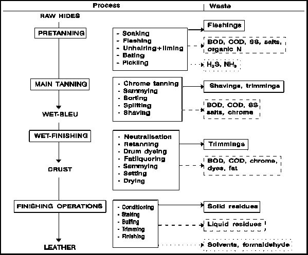 Figure 3 presents a flow diagram of a the tanning-process. Hides are a by-product of slaughter activities and can be processed into a wide range of end products. For each end product, the tanning process is different and the kind and amount of waste produced may vary enormously.