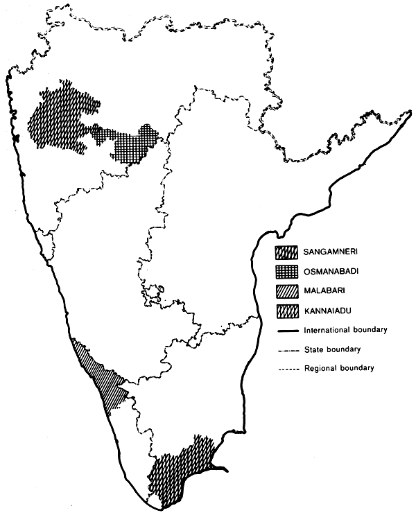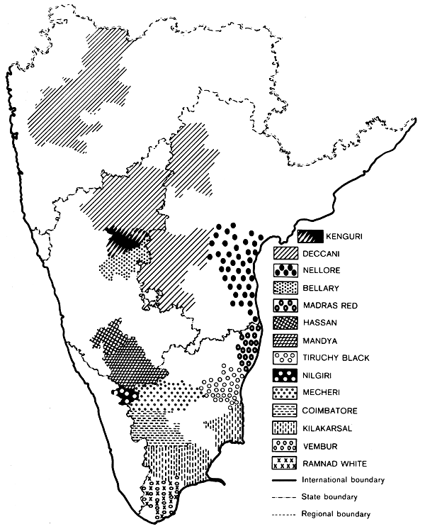 Important breeds of sheep of this area are Deccani (Bellary), Nellore, Madras Red, Mandya, Tiruchy Black, Mecheri, Ramnad White, Nilgiri, Coimbatore, Kilaikarsal, Kengiur and Vembur (Figure 5).