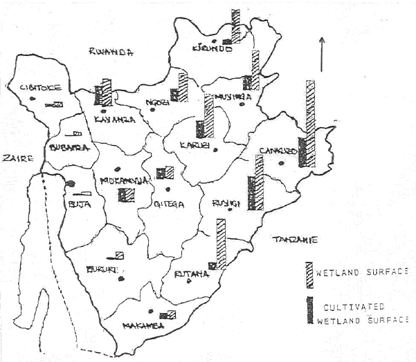 In Burundi the area covered by wetlands is about 112 000 hectares. 80% of this is appropriated to agriculture of which 56% is currently cultivated (Figure 1). Swamps in Muyinga, Ngozi and Ruyigi provinces occupy 70% of the total surface area of the swamps in the country (Figure 2).