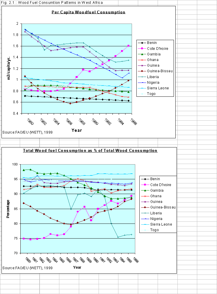 Fig. 2.1 shows that woodfuel forms over 85% of the total wood consumption in all the countries studied. The per capita consumption of fuelwood is above 0.6 m3/yr. for all countries involved with Côte d'Ivoire and Guinea-Bissau showing a steady rise in consumption from 1987 to 1996.