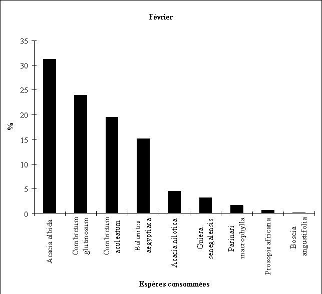 - la consommation d'Acacia albida débute fin octobre (feuillaison), augmente régulièrement en novembre et décembre (floraison) puis en janvier et février (fructification) pour cesser totalement par la suite.