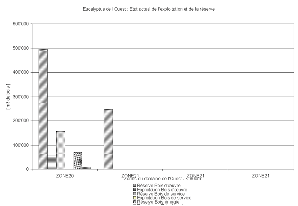 La dynamique de l’exploitation des peuplements d’eucalyptus peut être décrite en comparant la «possibilité » en surface et en volume avec la réserve estimée par zone de production (voir tableaux récapitulatifs en annexe 3).