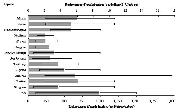 Les redevances sur le volume bois abattu (VBA) varient aussi suivant la qualité du bois. Par exemple, dans l’Etat d’Osun leur montant est basé sur la catégorie du bois. Les bois de catégorie I (qui comprennent Triplochiton, Mansonia et Afzelia spp) sont soumis à une redevance de 15 N par pied cube. Les bois de catégorie II comprennent : Pterygota, Lophira et Cylicodiscus, assujettis à une redevance de 10 N par pied cube, alors que pour d’autres essences moins connues, comme Celtis spp, la redevance n’est que de 6 N par pied cube.