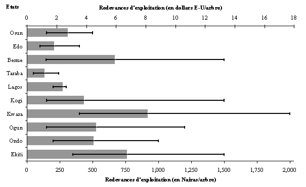 Cette méthode est utilisée dans tous les Etats situés dans la zone forestière du sud du Nigeria, pour les arbres coupés à l’intérieur et à l’extérieur du domaine forestier. Le taux du droit de coupe varie d’un Etat à l’autre, en fonction de la valeur économique et de la disponibilité des espèces, mais aussi du montant des recettes escompté. En outre, les taux varient suivant que les arbres sont prélevés à l’intérieur ou à l’extérieur du domaine forestier, des réserves ou des concessions. Par exemple, la redevance applicable à Afzelia africana va de 26 N par arbre dans l’Etat d’Enugu à 750 N par arbre dans l’Etat d’Ondo. Cette différence est due au fait que dans un Etat (Enugu), cette espèce est relativement abondante et peu demandée, alors que dans l’autre (Ondo) elle n’est pas disponible et très demandée.