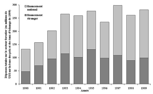 En ce qui concerne les pays couverts par l’étude, le montant total des dépenses consacrées par les gouvernements au secteur forestier en 1999 est présenté au Tableau 6, qui montre aussi le montant des fonds extérieurs alloués au secteur, tant globalement qu’en pourcentage des dépenses totales.