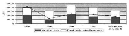 The main product of KEF is the Mountain Fresh line of jams and jellies. This enterprise has been supplying jams and jellies to major supermarkets in Manila since the late 1980s. BCN's objective was to strengthen the current operations and examine their links and contribution to conservation in the area. Analysis of sales and production show that gross revenue has declined to around 2,000 bottles or 650,000 pesos of sales annually between 1994 and 1997 (Figure 2).3 At this level, the enterprise is able to cover its variable cost but has not yet been able to cover fully its fixed cost. "The biggest challenge then at the present time is to bring the Food Processing Center to the point where its net profits can support the other activities of the KEF" according to Pastor Delbert Rice, the KEF Executive Director. To do this, KEF is strategizing with the Upland NGO Assistance Committee (UNAC) and the Philippine Business for Social Progress (PBSP) on ways to increase Mountain Fresh sales. Aside from promotions and increased marketing efforts, KEF will soon be introducing a line of low-sugar jams and jellies, which they expect will significantly add to their gross sales.