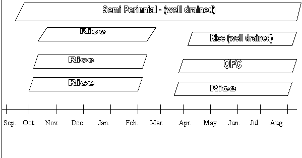In rice and non-rice cropping patterns, non-rice crops of the 12-16 weeks age class are preferred and most of the cash crops exceed this age limit. On the other hand, crops in a preferred age group, for example pulses and maize, do not generate sufficient income to be attractive alternative crops. Certain crops such as okra and groundnut, which tolerate excess soil moisture, get affected by viral diseases such as mosaic virus when cultivated in the dry season.