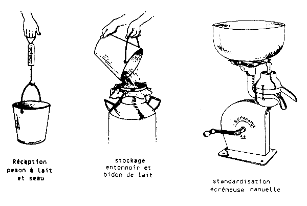 Réception: pour la réception du lait des producteurs eux-mêmes et du collecteur de lait, le matériel suivant est nécessaire : peson à lait, seau.