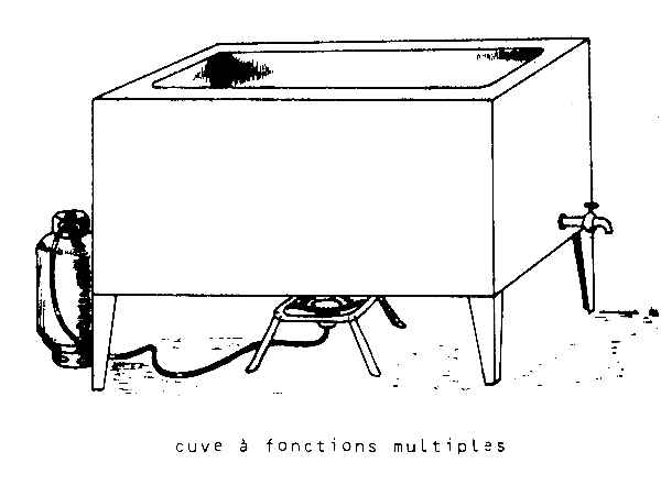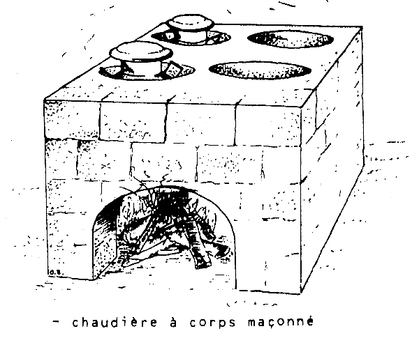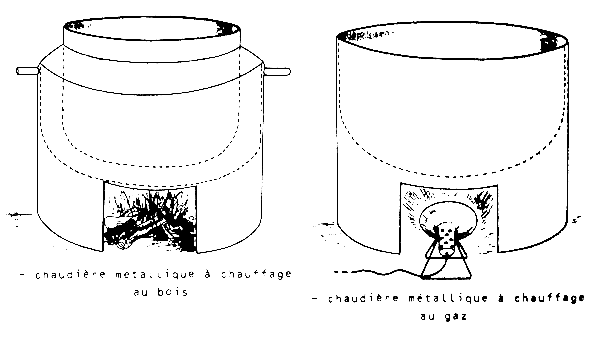 Thermisation: pour la thermisation plusieurs possibilités sont envisageables en fonction de l'énergie disponible localement. Si l'on se place dans le cas le plus défavorable, la seule source d'énergie disponible est le bois ou la tourbe. Dans ce cas il y a lieu d'utiliser une “chaudiére-Bain marie” selon le modèle ci-après.