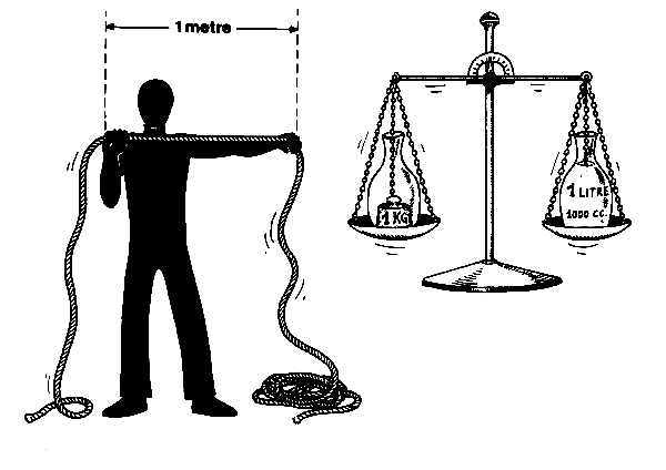 The measurements in the booklet are all given in the metric system. For the big measurements (like the length of nets or the weight of sinkers) it is all right to say that a metre is the distance from your left shoulder to your right hand (Fig. 1) and that a kilogram is the weight of a 1-litre bottle full of water, if you do not have any better way to find out. For the small measurements you can use the pictures in this booklet. Any time the words real size are written next to a picture, the thing you need to measure should be the same size as the one shown in the picture.