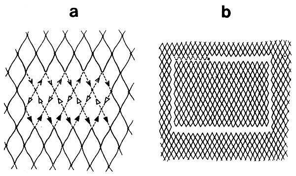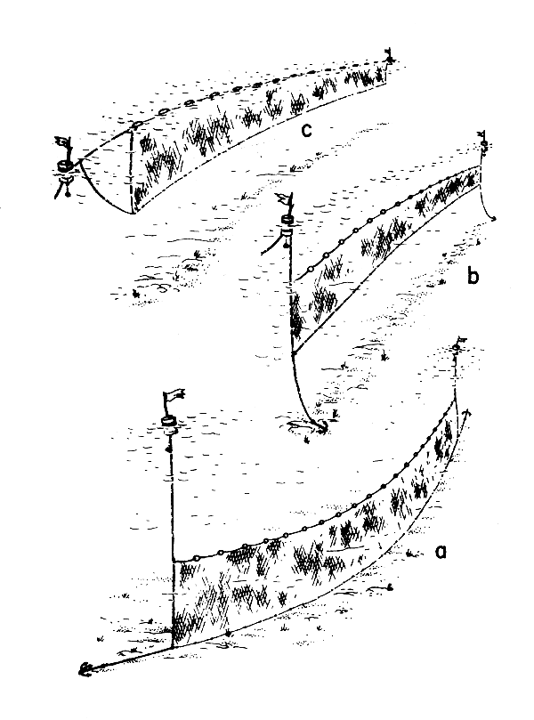 A gillnet catches fish by their gills. It works like this: the twine of the netting is very thin, and either the fish does not see the net or the net is set so that it traps the fish. The meshes of the net hang wide open. When the fish swims up to the net it sticks its head right into one of the meshes (Fig. 2a).
