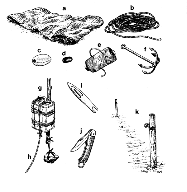 To make a net you will need netting (Fig. 5a), rope (Fig. 5b), floats (Fig. 5c) for the floatline, sinkers for the leadline (Fig. 5d) and plenty of twine to sew everything together (Fig. 5e). When you use the net you will need anchors (Fig. 5f), buoys (Fig. 5g), and anchor-ropes (Fig. 5h). You will need netting needles (Fig. 5i), a good knife (Fig. 5j) and posts or trees to hang the net from (Fig. 5k) while you work on it. You will need a place to work and should get together everything you need before you start.