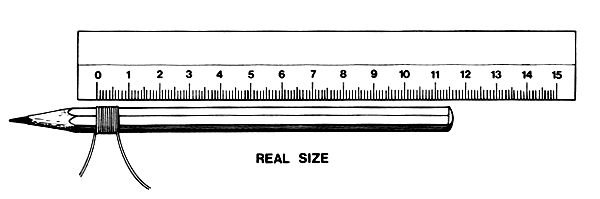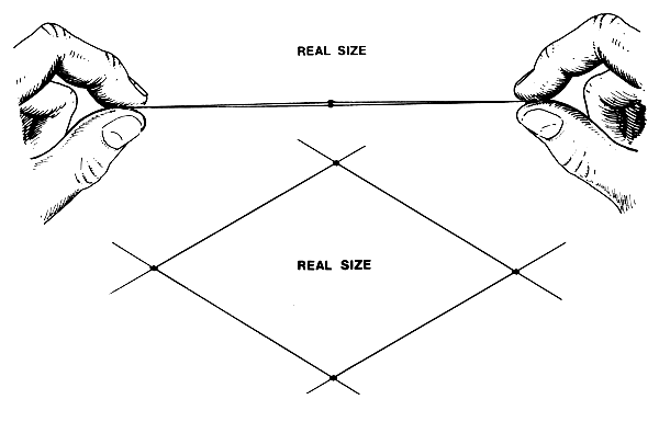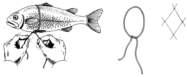 The meshes of the netting must be the right size for the fish you plan to catch. To find what size is best, take a fish of the sort you want to catch. Choose a medium size one, not a very big one or a very small one. Measure the fish's girth by wrapping a piece of twine around the fish at the thickest part of its body (the girth of the fish). To catch the fish you need a mesh which is about one quarter smaller than the fish's girth (Fig. 7).