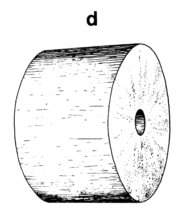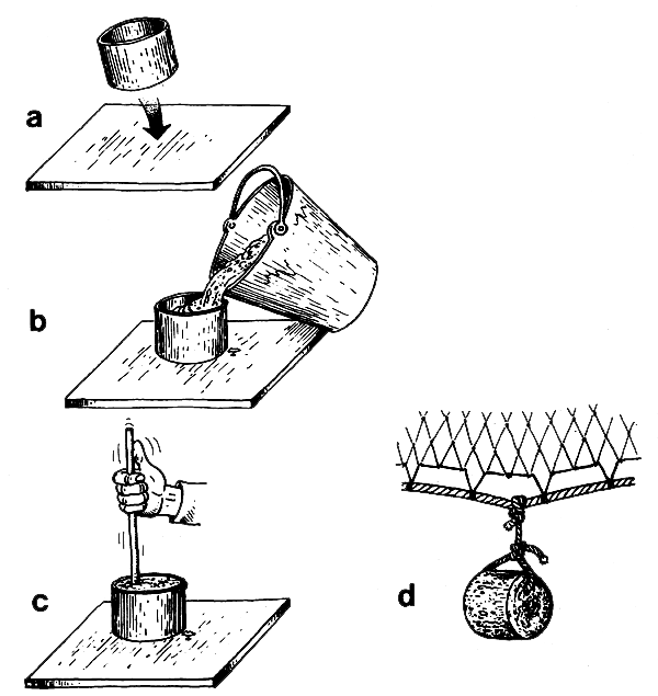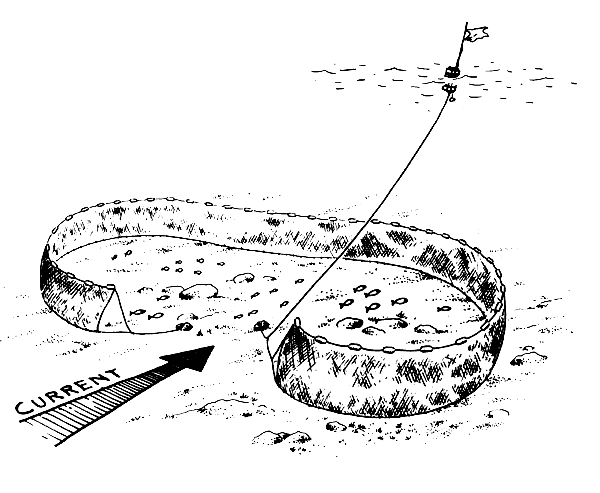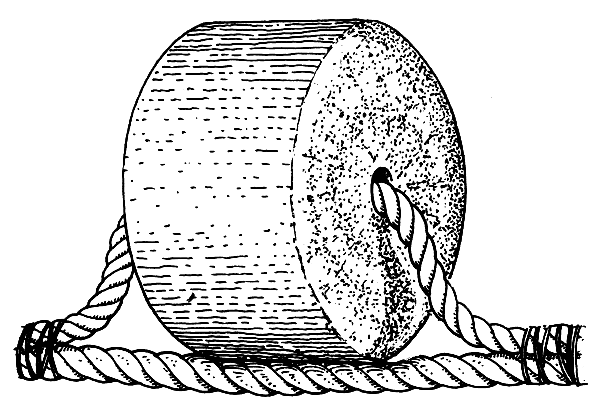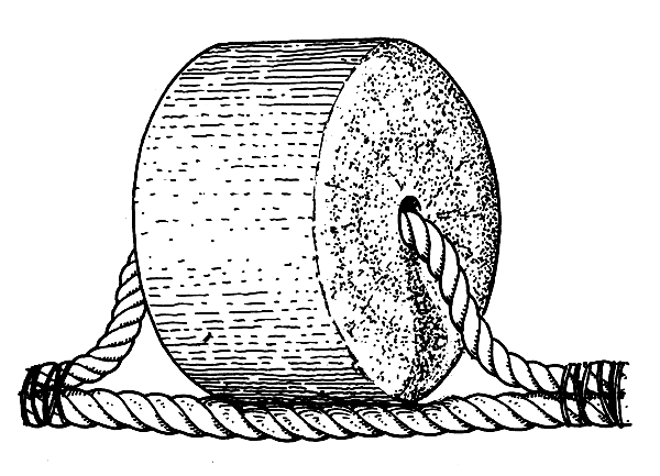 The sinkers along the leadline keep the floats from lifting the net off the bottom. You can use lead, iron rings or chain, stone or concrete (Fig. 12) to make your sinkers. Iron and stone are not as heavy in water as lead, so if you use these materials you will need more weight. If you use pieces of chain have every link of the chain well-tied (seized) to the leadline or even wrapped in canvas so that it will not catch the net. You can also use small bags full of sand as sinkers. Stones and concrete sinkers must be made smooth.