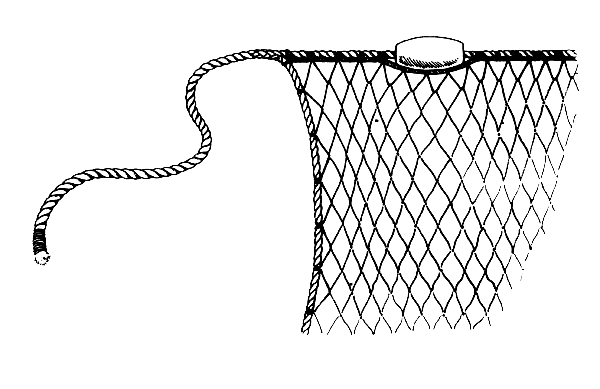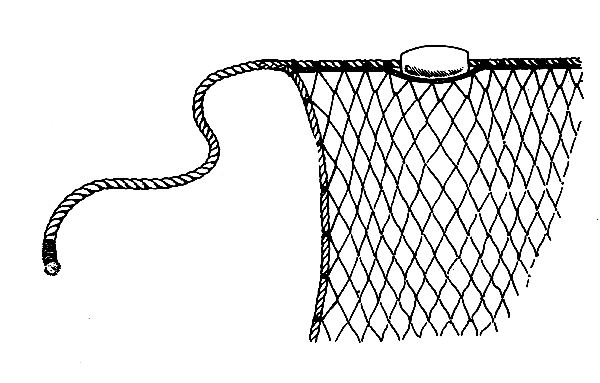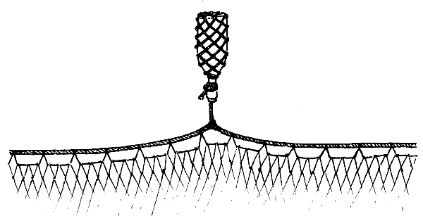 On very soft bottoms where the leadline sinks into the mud use a thick piece of rope whipped with hemp twine instead of sinkers (Fig. 29). Put pieces of iron or lead inside the whipping and fasten the rope to the leadline with heavy twine. Do not use stone sinkers if the bottom is very soft; use large mussel shells instead.