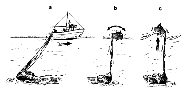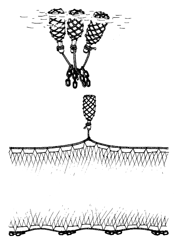 Gillnets can be used in many ways. They can be made to rest on the bottom (Fig. 3a), to hang between the bottom and the surface (Fig. 3b), or to float on the surface (Fig. 3c). Gillnets can be set in one place with anchors (Figs. 3a and 3b), or allowed to drift with the current (Fig. 3c).