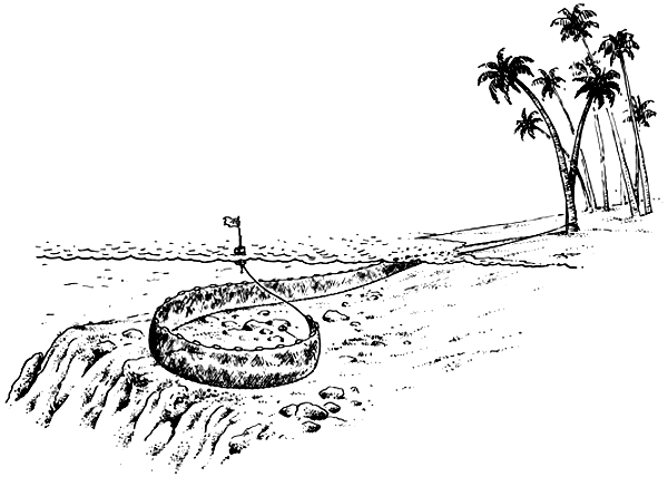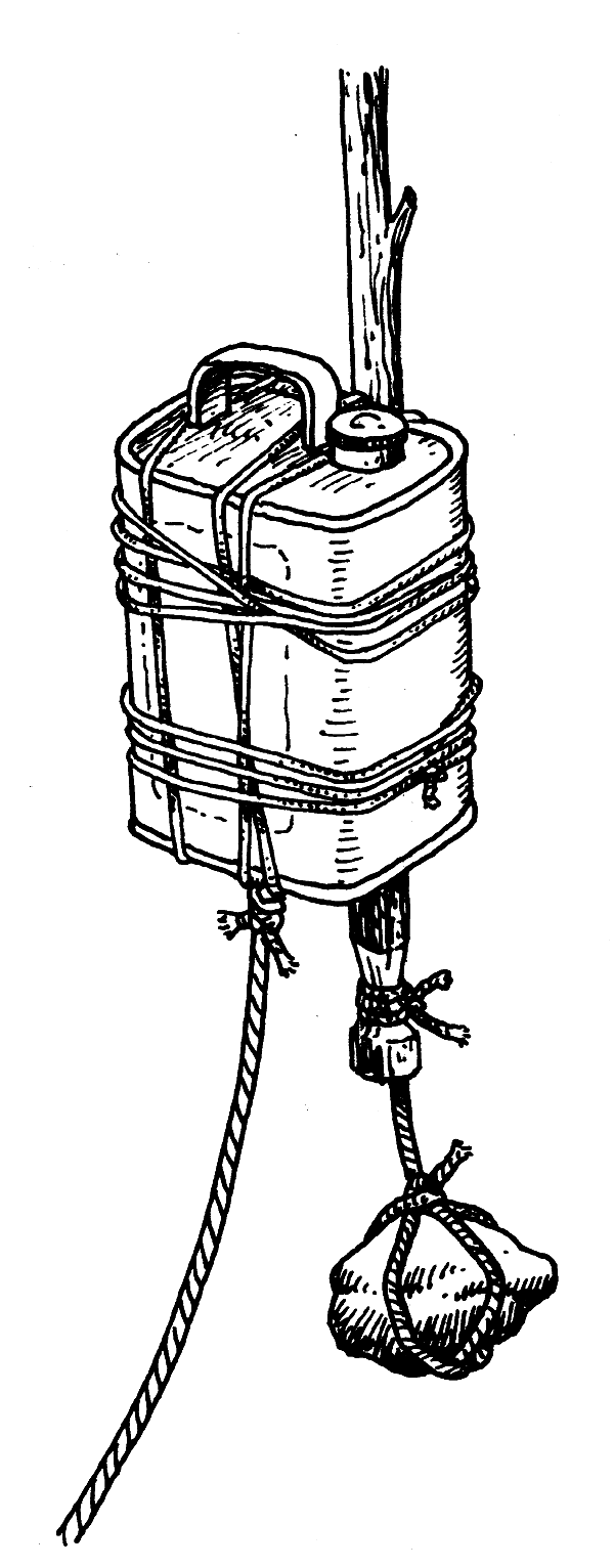 The buoys attached to each anchor-rope mark the place where the net is set. An innertube (Fig. 14), a tin container (Fig. 15), a light-wood log or a big plastic bottle will make a good buoy. If the buoy is painted a bright colour it will be easy to see. You can always attach to the buoy a wooden pole with a flag or a bunch of palm leaves, tree branches or any other thing that you can see from far away (Fig. 16).