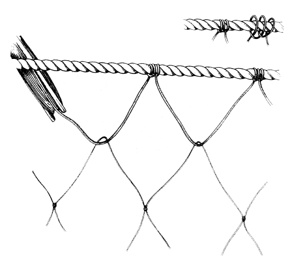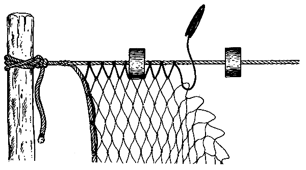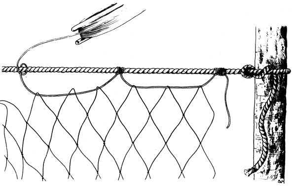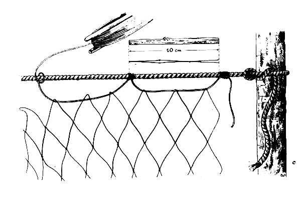 Now pass the twine through the next mesh and lash it to the floatline 10 centimetres further along. Continue like this until you have hung the net all along the line between the two posts. Make sure that all the staples are the same length and that they are lashed to the line exactly 10 centimetres apart.