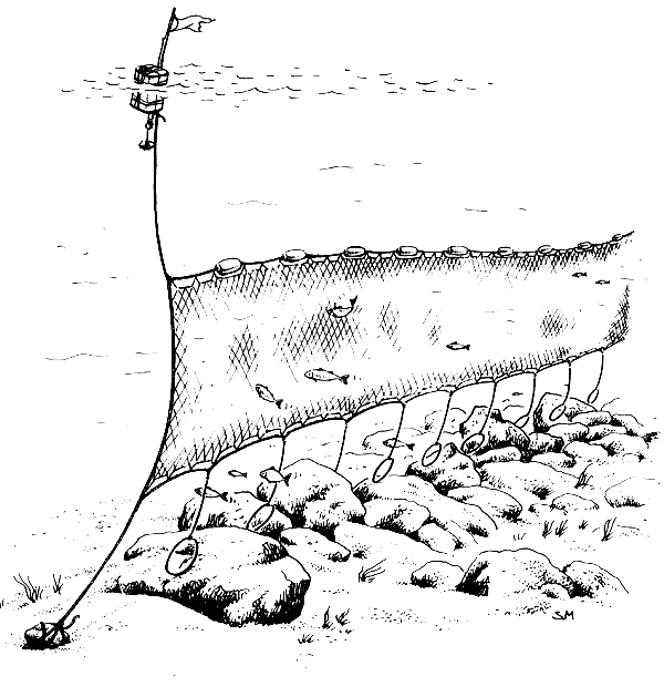 A gillnet catches fish that swim into it. It has a floatline along the top and a leadline along the bottom. The netting hangs straight up-and-down in the water like a good fence (Fig. 2).