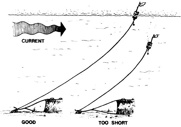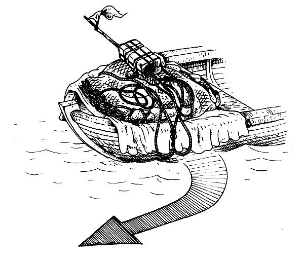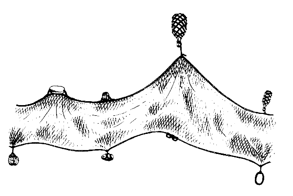 If possible, the floats and sinkers should be round and smooth. Pointed or jagged floats and sinkers will tangle your net and give you plenty of trouble. It is best if your sinkers all have the same weight and you floats all have the same buoyancy, or lifting power. You can see in the picture (Fig. 30) what happens if the floats and sinkers have very different weights and buoyancies.