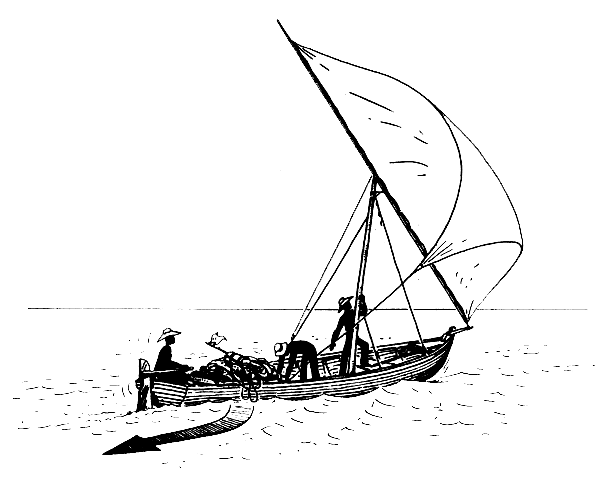 Sometimes it is good to have an engine, either inboard or outboard. It will save you work and let you go further to find fish. But an engine is expensive to buy and use. You will have to catch a lot of fish to pay for it. You do not have to have an engine to fish with bottom-set gillnets. Paddles, oars or sails are good too. Even if you get an engine you should keep your oars and sails. Use them when there is a good wind or when you are not in a hurry. This way you can save fuel and money (Fig. 32). With a small boat it is best to rely on oars or sails.
