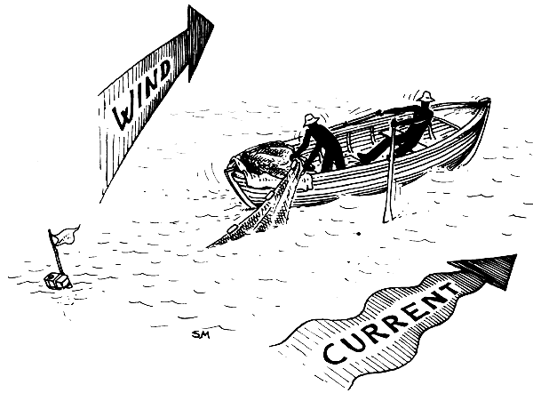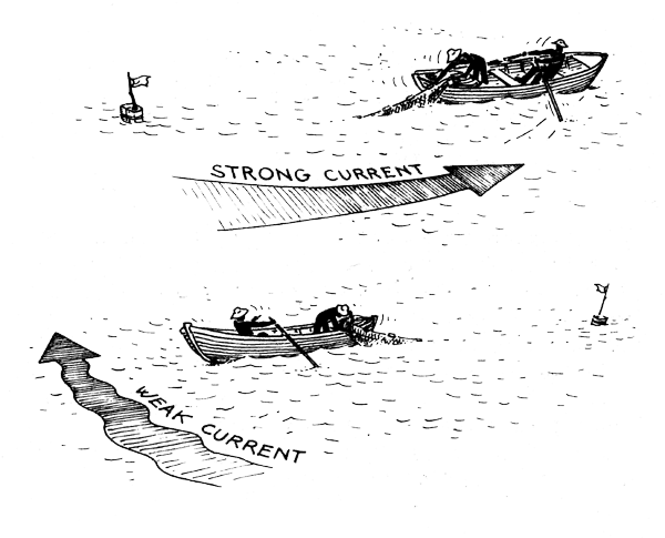 When your boat is in order you can go out and set the nets. The first few times you use the nets it is best to pick a spot where the bottom is smooth and free from fasteners (rocks, big logs or anything that will snag the net on the bottom). It is good to set the nets in shallow water the first time so you can check to be sure the floats and the sinkers are holding the net in the right way. Prepare your nets by stacking them neatly in the back of the boat. In a boat with a pointed stern, the floats should be facing the front of the boat and the sinkers facing the back (Fig. 34). When you come to the spot where you want to set the nets, see which way the wind and the currents are moving. If the wind or current is strong you will have to set the nets in the same direction. If the current is weak it is a good idea to set the nets across it (Fig. 35).