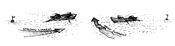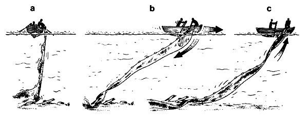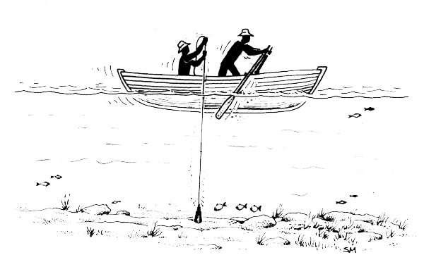 Find out how deep the water is by sounding. Tie a weight to the end of a thin rope that has been marked to show how long it is. Drop the weight into the water and see how much rope has gone out when the weight reaches the bottom. If the boat is moving with the wind or current you must throw the weight ahead so that the rope will be straight up-and-down (Fig. 36) when the weight is on the bottom. If you put grease or tar on the bottom of the weight it will pick up sand or mud from the bottom and you can tell if the bottom is hard or soft.