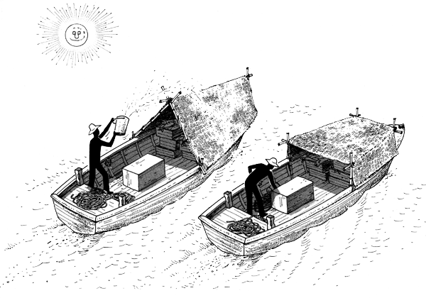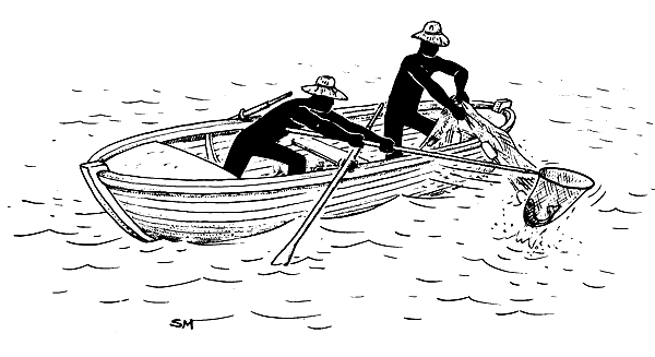 You must learn to use the nets you make in the best way. The first thing to do after you have made your nets is to put your boat in proper order for fishing. Your boat can be any size. A canoe or a flat-bottomed skiff is fine for fishing in lakes or rivers. A big canoe or boat of 5–7 metres is good for inshore fishing in the ocean. A big boat of 12–15 metres can be used for fishing far from land and staying out for more than one day at a time (Fig. 31).