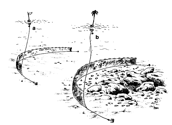 On rocky bottoms it is best to use fewer, heavier sinkers. It is best not to use expensive sinkers because it is easy to lose them on rocky bottoms. Use sinkers made of iron rings or stone. Fasten the sinkers to the leadline with long loops of heavy twine. If the bottom is very rocky you can attach the sinkers with extra-long (1–2 metres) loops of twine so that the leadline will float clear of the rocks when the net is set. If the net is too far off the bottom many fish will swim under and escape, so you will have to find the best way both to keep the net from getting stuck on the rocks and still catch fish (Fig. 28).