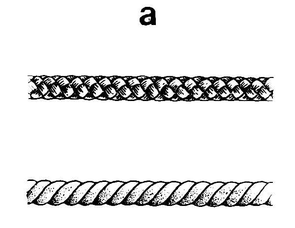 There are many different kinds of rope that you can use for the floatline, the leadline and the anchor-rope. You need rope that is stiff enough to help give the net its shape, but soft enough to be easy to coil and handle. Polyethylene, polypropylene and polyamide (nylon) are all good kinds to use. They can be either twisted or braided. You can also use hemp or manila rope. Grass rope is not very strong and it does not last very long, but you can use it if you have nothing else. The rope you use should be 6 millimetres in diameter but thicker if it is vegetable (non-synthetic). To make the net you need about 110 metres of rope, and you will also need more rope for the anchor-ropes.