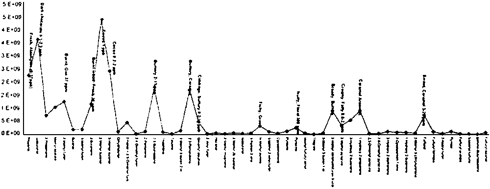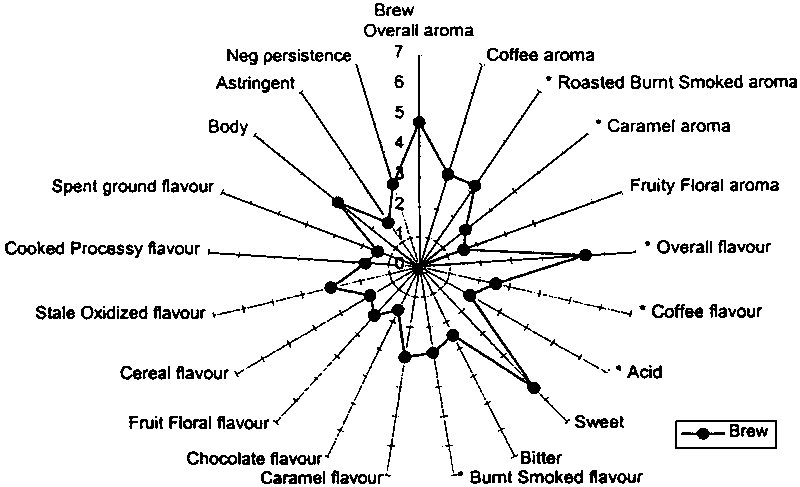 A technique which proves very useful in the evaluation of new processes, particularly in soluble coffee manufacture, indicates the flavor evaluation by a trained test panel in the form of a star diagram, where notes like burnt, cooked, fruity are profiled semi-quantitatively. The sample analyzed in Figure 2, has been characterized by the panel, as possessing an intense overall aroma and flavor, a roasted/burnt/smoked note, and a stale/oxidized off-flavor.