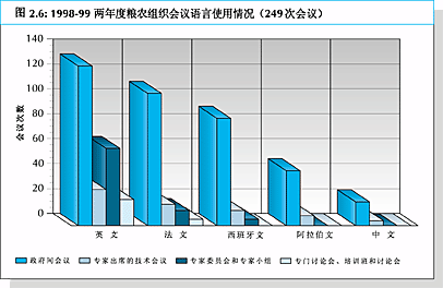 51. 语言和文化多样性是国际合作的基本特色。粮农组织成员和伙伴以本组织正式语言表达意见和收取文件及出版物的能力加强了它们对粮农组织活动的参与以及从中获得的价值。计划和财政两委员会1999年5月对粮农组织语言进行了审查(PC81/6-FC92/13)。两委员会重申章程中概述的粮农组织各种语言法定平等的原则,同时重申需要保持务实和灵活的方针。它们要求关于计划执行情况的报告今后应当包括关于本组织语言使用的进展情况一节。列入本节就是为了遵照这一要求。鉴于委员会提出要求之后提供进展情况报告的时间尚不足,下列信息仅为其今后报告进展情况提供基准。主要关注领域是会议、出版物、电子材料(世界农业信息中心和粮农组织因特网站)、术语和人力资源管理。