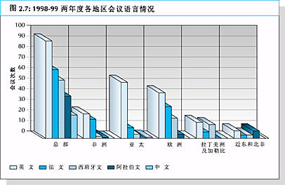 54. 总部和各区会议语言使用情况见图2.7。英语是总部及亚太和欧洲召开的会议使用的主要语言。在非洲法语和英语使用量几乎相当。在拉丁美洲和加勒比,主要语言是西班牙语和英语。在近东和北非,主要语言是阿拉伯语和英语。如会议以单一语言召开时,往往是英语;在1998-99两年度召开的100次单语会议中有94次使用英语。在使用其它语言时一般包括英语;在1998-99两年度召开的仅有1次多语会议没有使用英语。