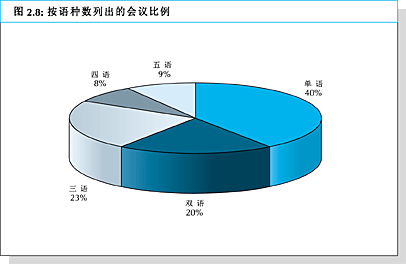 55. 使用若干语言的会议比例见图2.8。使用五种语言的会议仅占会议的9%,但为这些会议提供同传占同传工作量的52%,以同传天数计算。四种语言的会议占8%,占同传工作量的18%。三种语言的会议占会议的23%,占同传工作量的18%,二种语言的会议占会议的20%,占同传工作量的12%。五种语言的会议平均需要大约24名同传,四种语言的会议需要12名同传,三种和二种语言的会议各需要5和3名同传。一般讲每增加一种语言,会议所需要的同传数量就会增加1倍。