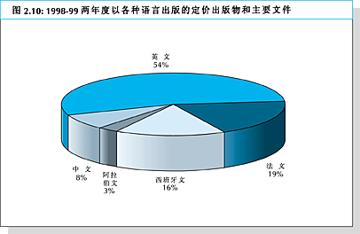 60. 如图2.10所示,英文占1998-99两年度制作的所有定价出版物和主要文件的一半以上。17%用法文、15%用西班牙文、5%用阿拉伯文。中文文件占总量的9%,通过中文出版计划在总部和中国出版。与中国农科院合作执行这项计划。优点是该国直接参与选择、出版和发行要翻译的文件。