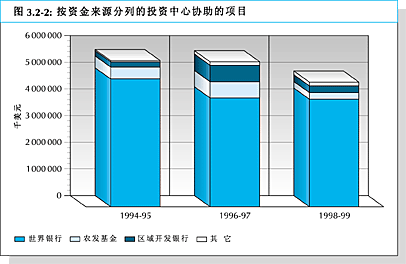 391. 1998-99两年度以投资中心大量援助制定并经批准获得供资的项目数字略低于1996-97两年度(表3.2-1),但相当于前两个两年度。1998-99两年度为76个项目获批准供资,而1996-97两年度为88个项目。投资总额为47亿美元,而1994-95两年度为55亿美元,1996-97两年度为54亿美元。1998-99两年度外部供资承诺额为32亿美元,略低于1996-97两年度的35亿美元。