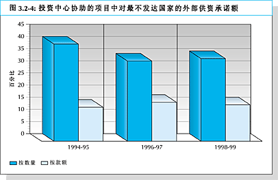 399. 对最不发达国家的外部资金承诺额保持稳定。从1996-97两年度的16%略减少到1998-99两年度的15%,项目数量从29个减少到26个;项目数量仍为总量的大约三分之一(图3.2-4)。