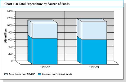 1. As stated in the Director-General's Foreword, the Organization sought to deliver its approved programme of work in the face of continued austerity. The Regular Programme Appropriation remained unchanged at US$ 650 million, entailing a decrease in real terms. As shown in Chart 1.1 total expenditure increased by about 3 percent from US$ 1 162 million in 1996-97 to US$ 1 200 million in 1998-99. This was largely the result of a US$ 125 million increase in emergency assistance related to the Iraq Oil-for-Food programme, which contributed to a 16 percent increase in expenditure under Trust Funds and the United Nations Development Programme (UNDP). Expenditure under General and Related Funds, which includes the Regular Programme Appropriation and reimbursements from jointly financed investment activities and support costs, declined by about 5 percent.
