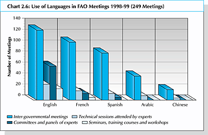 51. Linguistic and cultural diversity are essential features of international cooperation. The ability of FAO members and partners to express themselves and receive documents and publications in the Organization's official languages enhances their participation in FAO activities and the value they gain from it. The Programme and Finance Committees undertook a review of FAO language policy (documents PC 81/6 - FC 92/13) in May 1999. The Committees reaffirmed the principle of statutory parity of FAO languages, as outlined in the Constitution, while reiterating the need to maintain a pragmatic and flexible approach. They requested that reporting on programme implementation should in future include a section on progress in the use of languages within the Organization. The current section is included in response to this request. Given that insufficient time has passed for a progress report since the Committees' request, the following information is intended to provide a baseline against which future progress can be reported. The main areas of concern are meetings, publications, electronic material (the World Agricultural Information Centre -WAICENT and the FAO Internet site), terminology and human resource management.