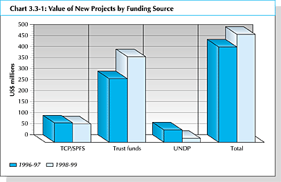 403. About 65 percent of the projects approved and operational in 1998-99 had budgets of less than US$ 250 000, more than half of these being between US$ 100 000 and US$ 250 000, as shown in Chart 3.3-2. The decline in large projects continued with only 5 percent of approved projects having budgets above US$ 1 million compared to 10 percent in 1996-97 and more than 25 percent in the past. TCP and SPFS accounted for 46 percent of the new projects approved, followed by Trust Funds at 44 percent and UNDP at 10 percent. For UNDP this was a decline from 15 percent in 1996-97. The 1998-99 biennium was the first time that new TCP and SPFS projects exceeded the number of new Trust Fund projects.