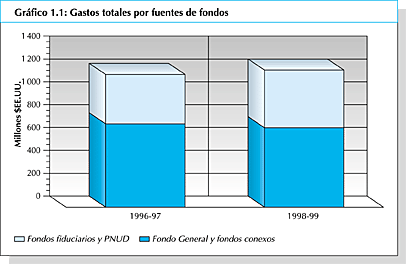 1. Como se indica en el Prólogo del Director General, la Organización trató de ejecutar su programa de trabajo aprobado en un contexto de austeridad. La consignación del Programa Ordinario permaneció invariable en 650 millones de dólares EE.UU., lo que comportó una disminución en términos reales. Como se indica en el Gráfico 1.1, los gastos totales aumentaron en torno al 3 por ciento, pasando de 1 162 millones de dólares EE.UU. en 1996-97 a 1 200 millones EE.UU. en 1998-99. Ello fue resultado en gran medida de un incremento de 125 millones de dólares en la asistencia de urgencia relacionada con el programa de petróleo por alimentos en el Iraq, que contribuyó a un aumento del 16 por ciento los gastos correspondientes a los Fondos Fiduciarios y al Programa de las Naciones Unidas para el Desarrollo (PNUD). El gasto con cargo al Fondo General y fondos conexos, que incluyen la consignación del Programa Ordinario y los reembolsos de las actividades de inversión financiadas conjuntamente y de los gastos de apoyo, disminuyó alrededor del 5 por ciento.