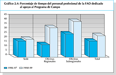 44. La descentralización de la responsabilidad primordial con respecto a los SAT a las Oficinas Regionales y Subregionales aparece claramente en el Gráfico 2.4. En las Oficinas Regionales se duplicó con creces el tiempo dedicado por su personal técnico profesional a los servicios de apoyo técnico al Programa de Campo, pasando del 14 por ciento en 1996-97 al 33 por ciento en 1998-99. En las Oficinas Subregionales, el apoyo al Programa de Campo aumentó del 26 al 40 por ciento.