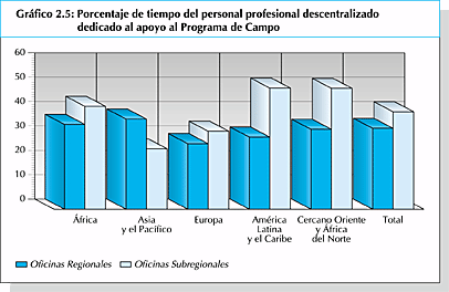 45. Aunque hubo algunas variaciones entre las regiones, como se indica en el Gráfico 2.5, el tiempo del personal dedicado al apoyo al Programa de Campo fue superior al 25 por ciento en todas las Oficinas Regionales y Subregionales. La tendencia a niveles superiores de apoyo al Programa de Campo en las Oficinas Subregionales está en consonancia con la política de que dicho apoyo debe suministrarse desde los lugares más cercanos a los países beneficiarios.