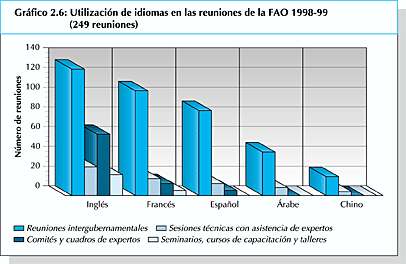 51. La diversidad lingüística y cultural es una característica esencial de la cooperación internacional. La posibilidad de que los miembros y asociados de la FAO se expresen y reciban los documentos y publicaciones en los idiomas oficiales de la Organización incrementa su participación en las actividades de la FAO y el valor que obtienen de ellas. Los Comités del Programa y de Finanzas hicieron un examen de la política de la FAO en materia de idiomas (documentos PC 81/6 - FC 92/13) en mayo de 1999. Los Comités reafirmaron el principio de la paridad estatutaria de los idiomas de la FAO como se expresa en la Constitución, reiterando a la vez la necesidad de mantener un enfoque pragmático y flexible. Pidieron que, al informar en el futuro sobre la ejecución del programa, se incluyera una sección sobre los progresos en la utilización de los idiomas dentro de la Organización. Como el tiempo transcurrido desde la solicitud de los Comités no ha sido suficiente para hacer un informe sobre los progresos, la información que sigue tiene por objeto ofrecer una base que sirva de referencia para informar sobre los progresos en el futuro. Las principales esferas de interés son las reuniones, publicaciones, material electrónico (Centro de información agraria mundial - WAICENT y sitio de la FAO en Internet), terminología y gestión de los recursos humanos.