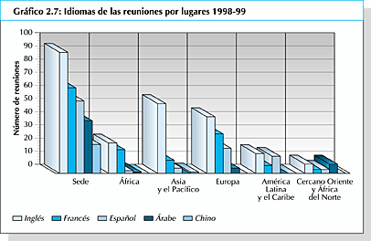 54. En el Gráfico 2.7 se indican los idiomas utilizados en las reuniones en la Sede y por regiones. El inglés es el idioma preponderante en las reuniones celebradas en la Sede, así como en Asia y el Pacífico y en Europa. En África, se utilizan casi igual el francés y el inglés. En América Latina y el Caribe, los idiomas principales son el español y el inglés. En el Cercano Oriente y África del Norte, los idiomas son el árabe y el inglés. Cuando se celebran las reuniones en un solo idioma, éste tiende a ser el inglés, lo que ocurrió en 94 de las 100 reuniones en un solo idioma celebradas en 1998-99. Se incluye también generalmente el inglés cuando se utilizan otros idiomas; 1998-99 hubo sólo una reunión en varios idiomas en la que no se incluyó el inglés.