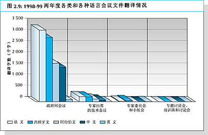 60. 如图2.10所示,英文占1998-99两年度制作的所有定价出版物和主要文件的一半以上。17%用法文、15%用西班牙文、5%用阿拉伯文。中文文件占总量的9%,通过中文出版计划在总部和中国出版。与中国农科院合作执行这项计划。优点是该国直接参与选择、出版和发行要翻译的文件。